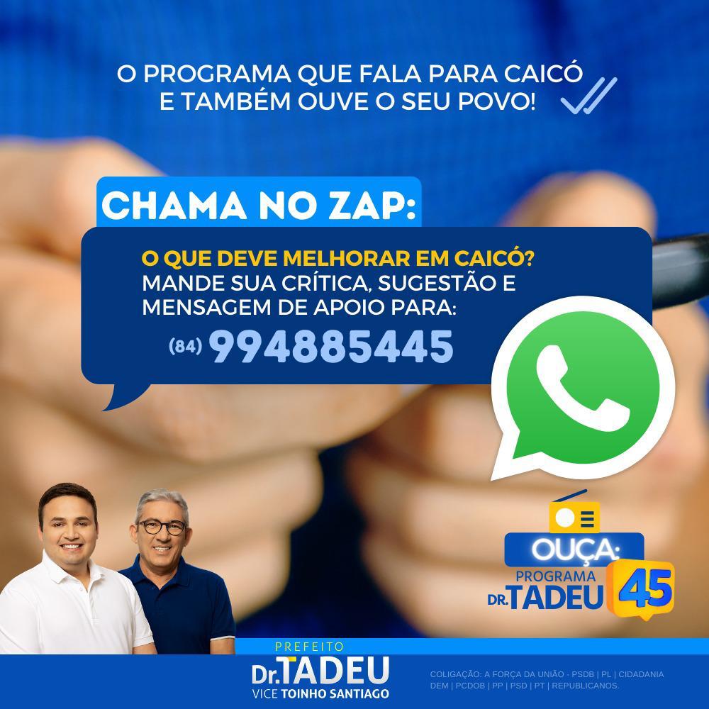 Pelo contato (84) 99485-5445, os ouvintes poderão mandar suas críticas, sugestões e mensagem de apoio a Dr. Tadeu e Toinho. Os candidatos que falam para Caicó e também ouvem o seu povo.